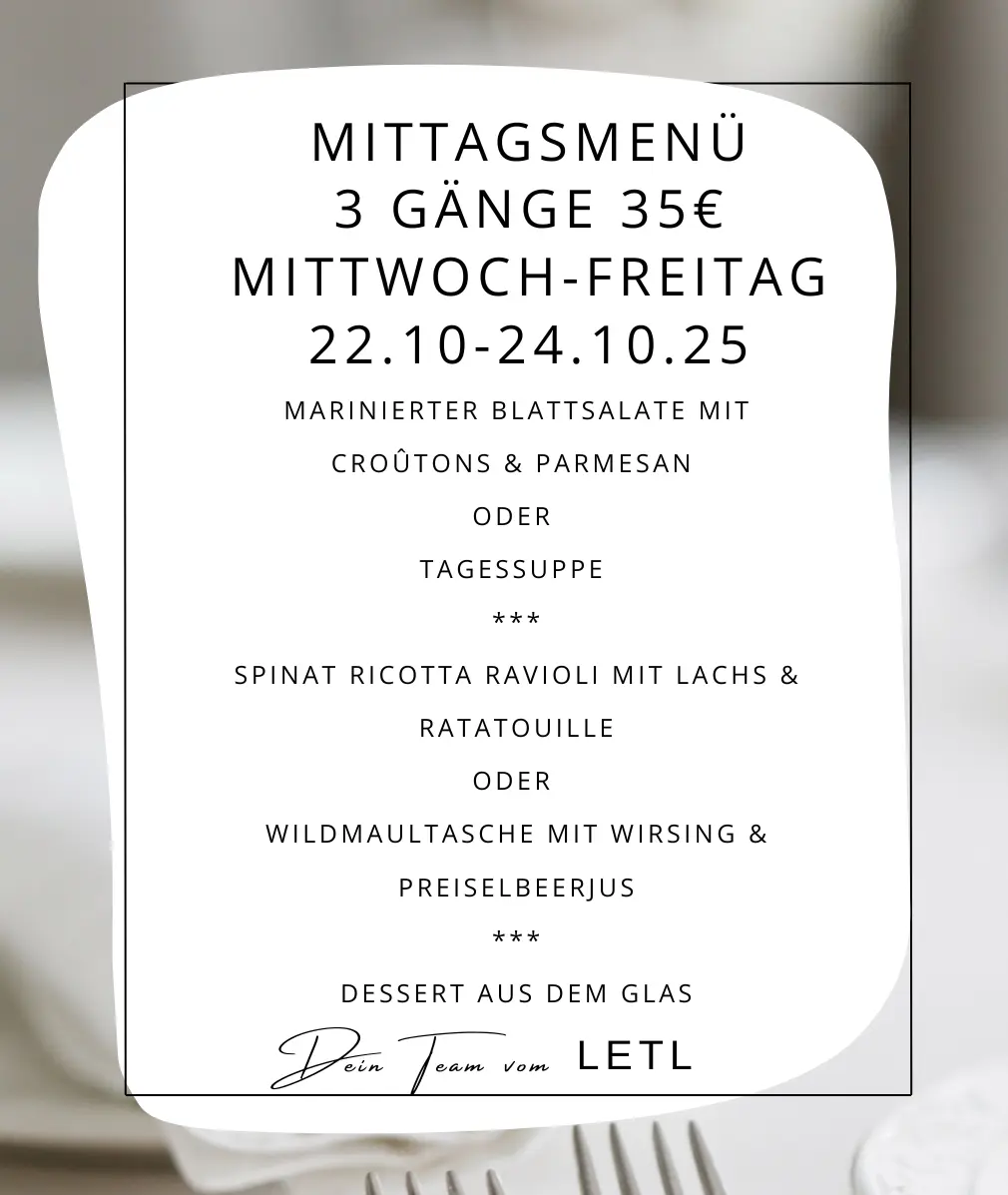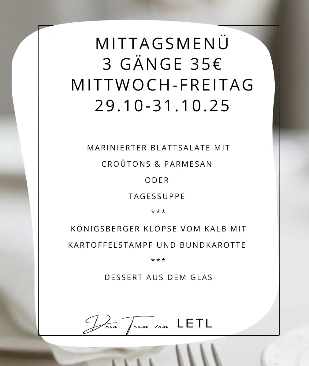 Entdeckt unsere saisonale Küche mit ausgewählten Zutaten, liebevoll zubereiteten Gerichten undeiner Auswahl an erlesenen Weinen und kreativen Cocktails. Im LETL verschmelzen kulinarischeLeidenschaft und herzliche Gastfreundschaft zu einem unvergesslichen Erlebnis.